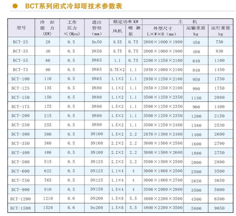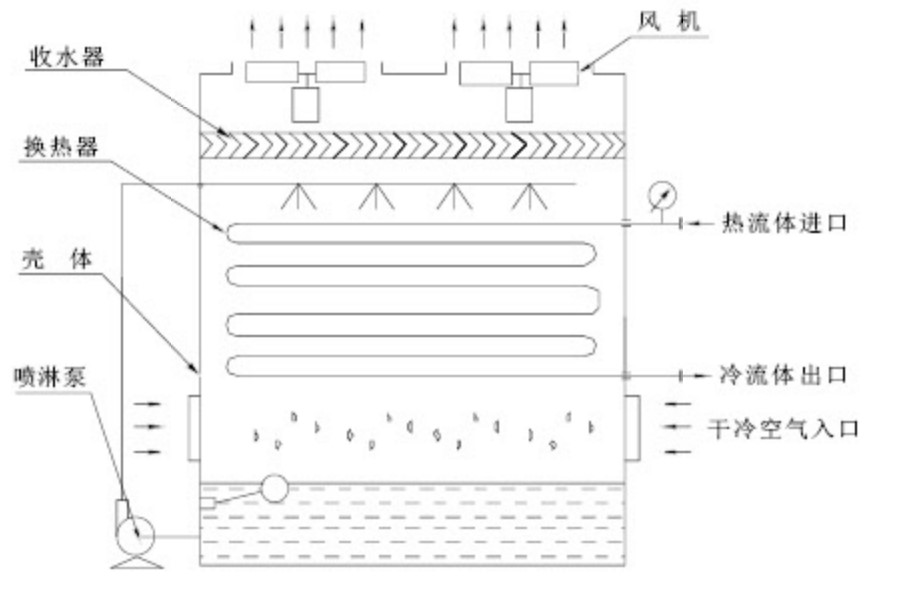 主機(jī)由殼體、換熱器、風(fēng)機(jī)、噴淋系統(tǒng)、收水器、水槽及管路閥門等零部件組成。
